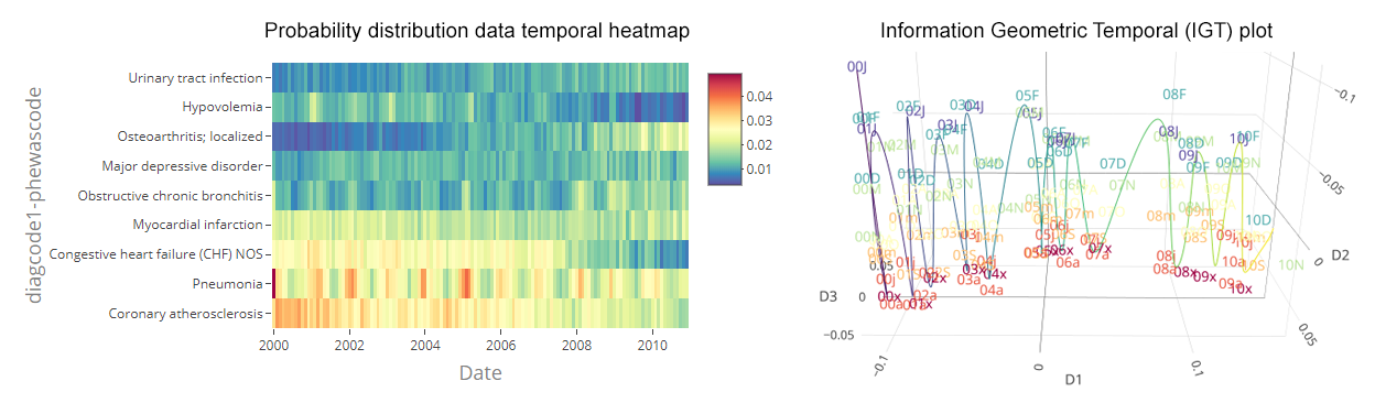 Our method is based upon the estimation and comparison of data statistical distributions over time 1-3. DTHs allow users to explore changes in absolute and relative frequencies over time—and at multiple variable values simultaneously (e.g., frequencies of phenotypes). IGT plots project time batches as a series of points. The distances between them correspond to the dissimilarity of their statistical distributions. This yields an empirical layout of temporal relationships between batches, namely a non-parametric temporal statistical manifold. IGT plots allow users to visually identify four types of changes: trends, represented as continuously flowing time batches; abrupt changes, shown as gaps between groups of batches; temporal subgroups, depicted as clusters of batches; and seasonality, portrayed as temporal cycles. Additionally, batches are labeled by date and color-coded to distinguish seasonal effects. For more information on how to use EHRtemporalVariability to delinate and identify these changes, please see the EHRtemporalVariability vignette