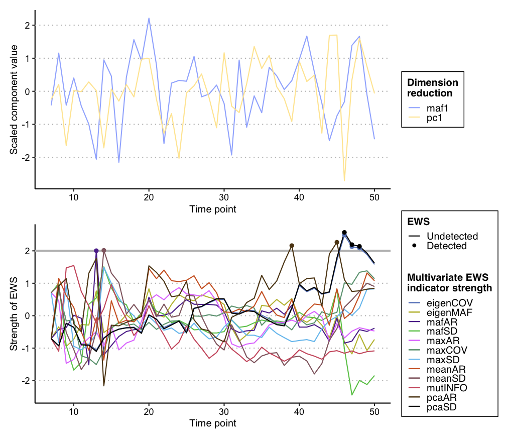 If we had data from multiple timeseries/measurements of the same system, we might be interested in multivariate early warning signals. These indicators exploit either dimension reduction techniques (such as Principal Component Analysis) or community average estimates to give an overall measure of system resilience (see Weinans et al. 2021 for an overview of each indicator).