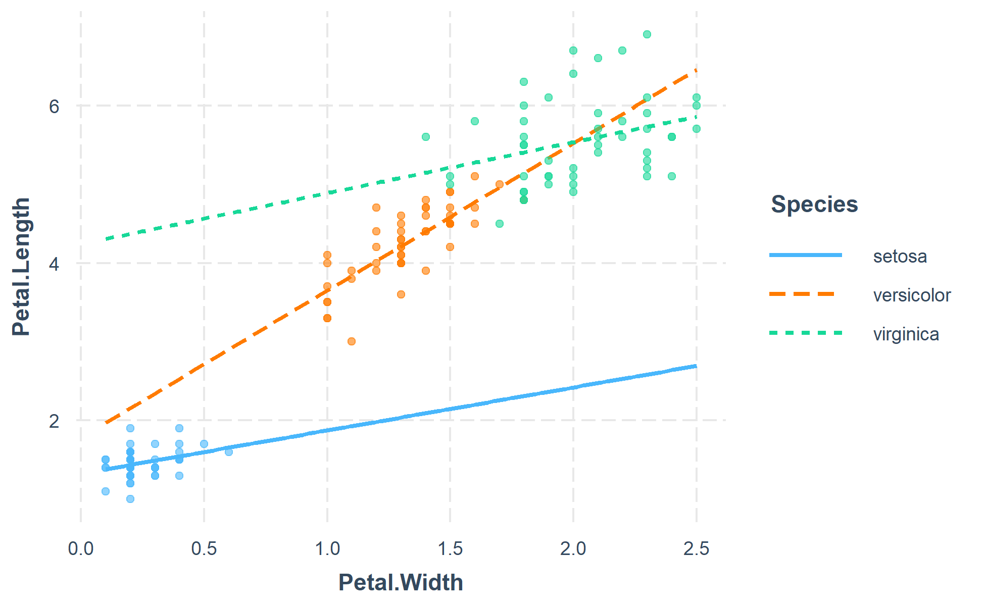 <- lm(Petal.Length ~ Petal.Width * Species, data = iris)