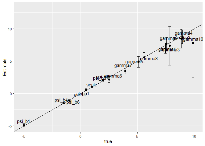 #> Note: All non-numeraire alpha's fixed to 0.Compare estimates to true values