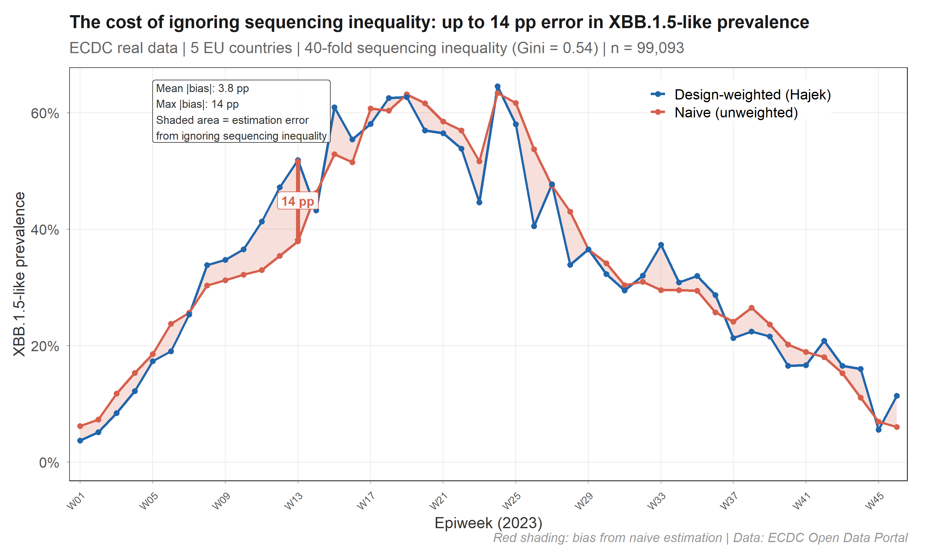 Each country’s bias depends on its sequencing rate and its local prevalence, and both change over time. Poland (under-sequenced, high prevalence) is systematically underweighted by naive methods. A single correction factor cannot fix this — you need per-stratum, per-period weights.
