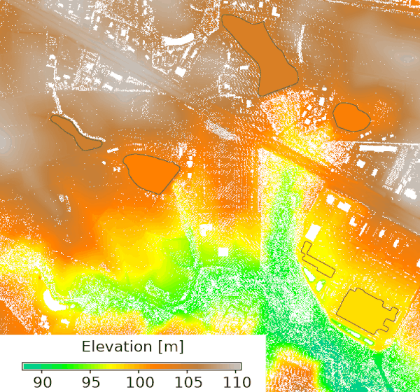 While this tool was designed for water bodies, it can be used for other purposes, e.g., for filling a gap in digital elevation models caused by excluding buildings.