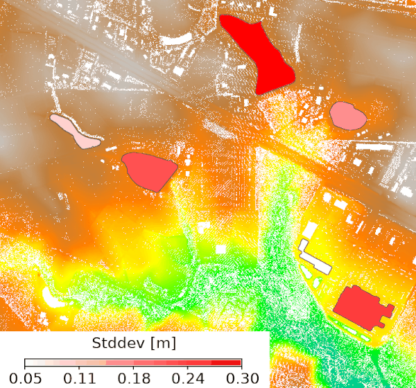 The output water_elevation is a raster map of water bodies where each water body has a single value representing the water level elevation derived from the lidar data at the edge of a water body. Since the elevation varies along the edge, option percentile is used to determine a single value. The variation along the edge can be examined with the water_elevation_stddev output representing the standard deviation of the lidar elevation values along the water body's edge. Higher deviation suggests problematic areas that need to be further inspected. The optional output filled_elevation is a raster map of the input ground surface filled with the computed water_elevation raster map.
