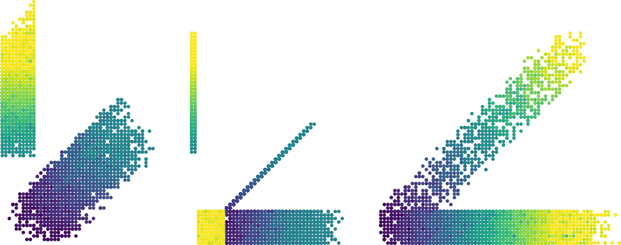 Figure: One scatter plot in with one variable as Z coordinate and another variable as color (two rotated views).