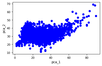 Create a scatterplot, plotting the values from the column pca_1 on the X-axis and pca_2 on the Y-asix, with blue dots.