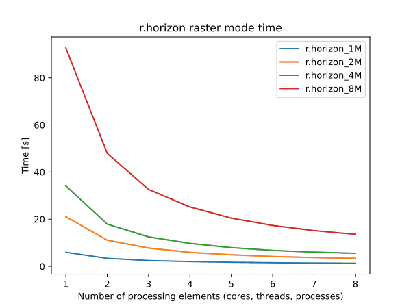 Parallel processing is implemented for the raster mode. To enable parallel processing, the user can specify the number of threads to be used with the nprocs parameter. Figures below show benchmark results running on Intel® Core™ i5-13600K CPU @ 3.5GHz. See benchmark scripts in the source code for more details.