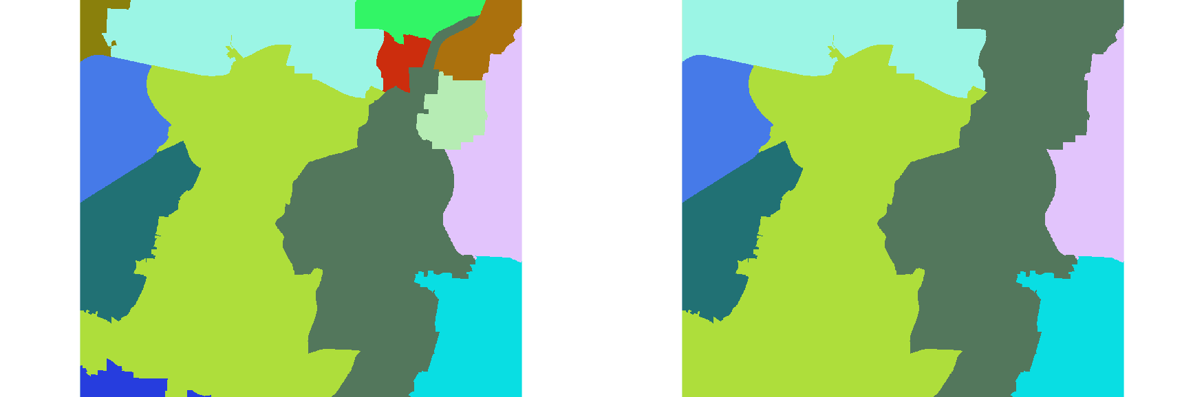 In this example, the ZIP code map in the North Carolina sample dataset is filtered for smaller areas which are substituted with the value of the respective adjacent area with largest shared boundary. Reclass by substitutional removing of areas minor of 1000 ha: