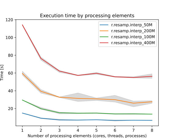By specifying the number of parallel processes with nprocs option, r.resamp.interp can run significantly faster, see benchmarks below.