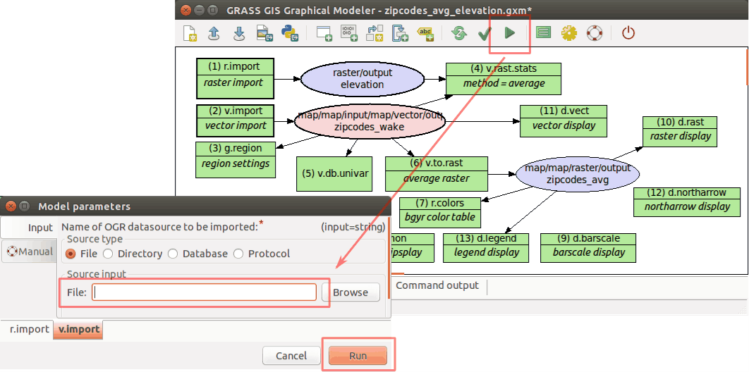 is run. So, instead of model parameters (e.g. r.import a v.import,
