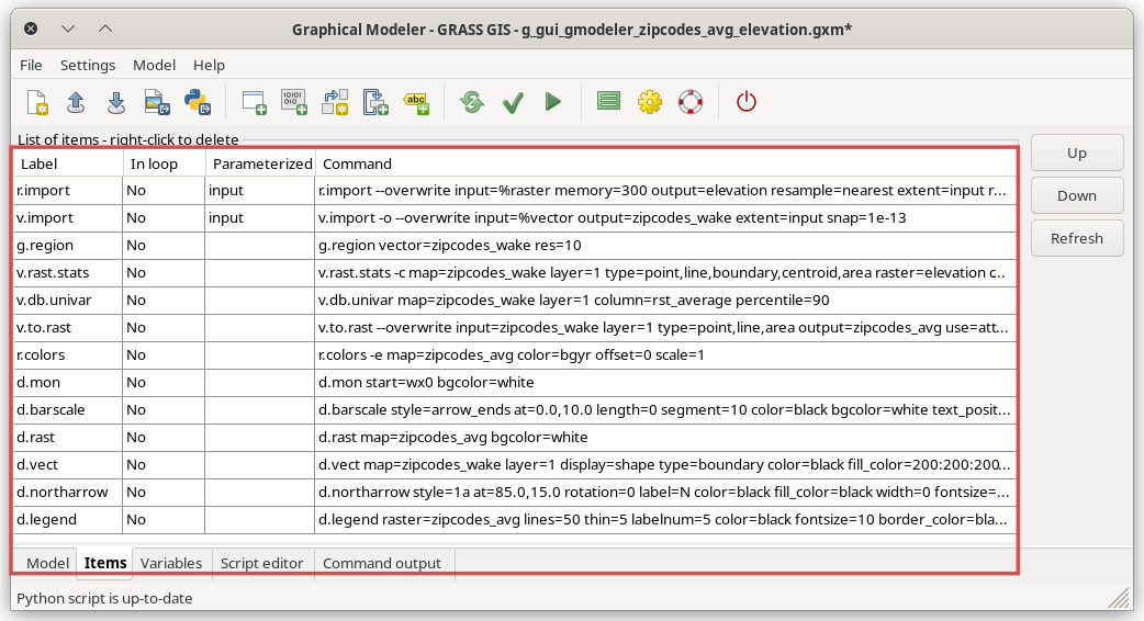 Finally, the model settings can be stored as a GRASS Model file with