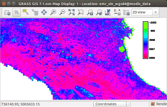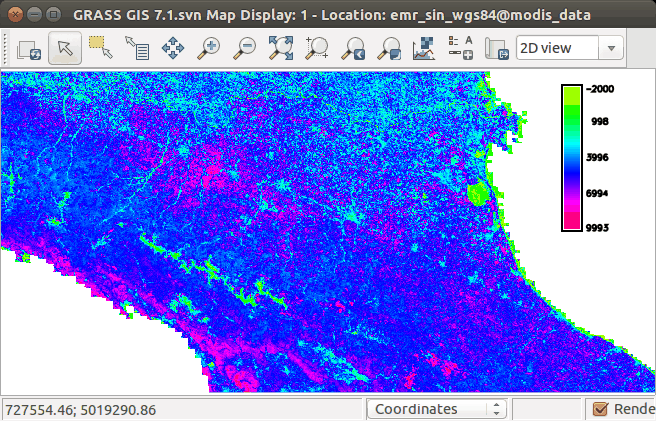 Figure: MODIS data representation in GRASS after Graphical Modeler