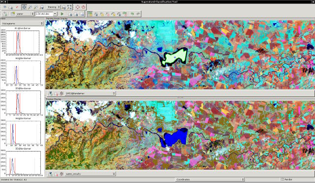 wxIClass is an interactive program that allows the user to create multiple training areas for multiple classes and calculate the spectral signatures based on the cells that are within the training areas. During this process the user will be shown histograms for each image band. The user can also display the cells of the image bands which fall within a user-specified number of standard deviations from the means in the spectral signature. By doing this, the user can see how much of the image is likely to be put into the class associated with the signature.