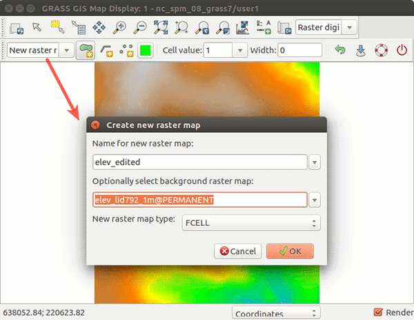 - Switch to Raster Digitizer and select a map to create. Select either a new raster or create a new raster from existing raster, also select raster type (CELL, FCELL, DCELL)