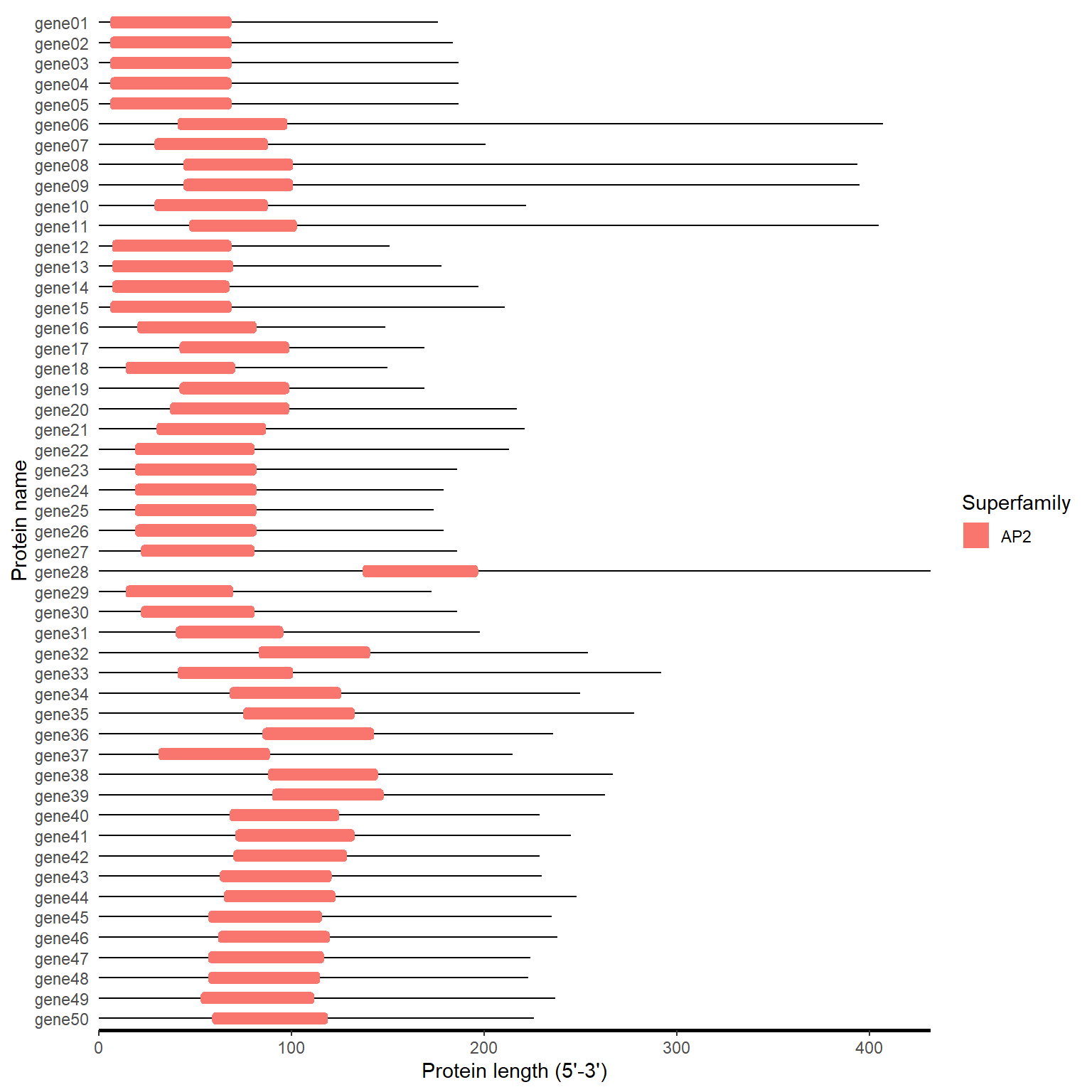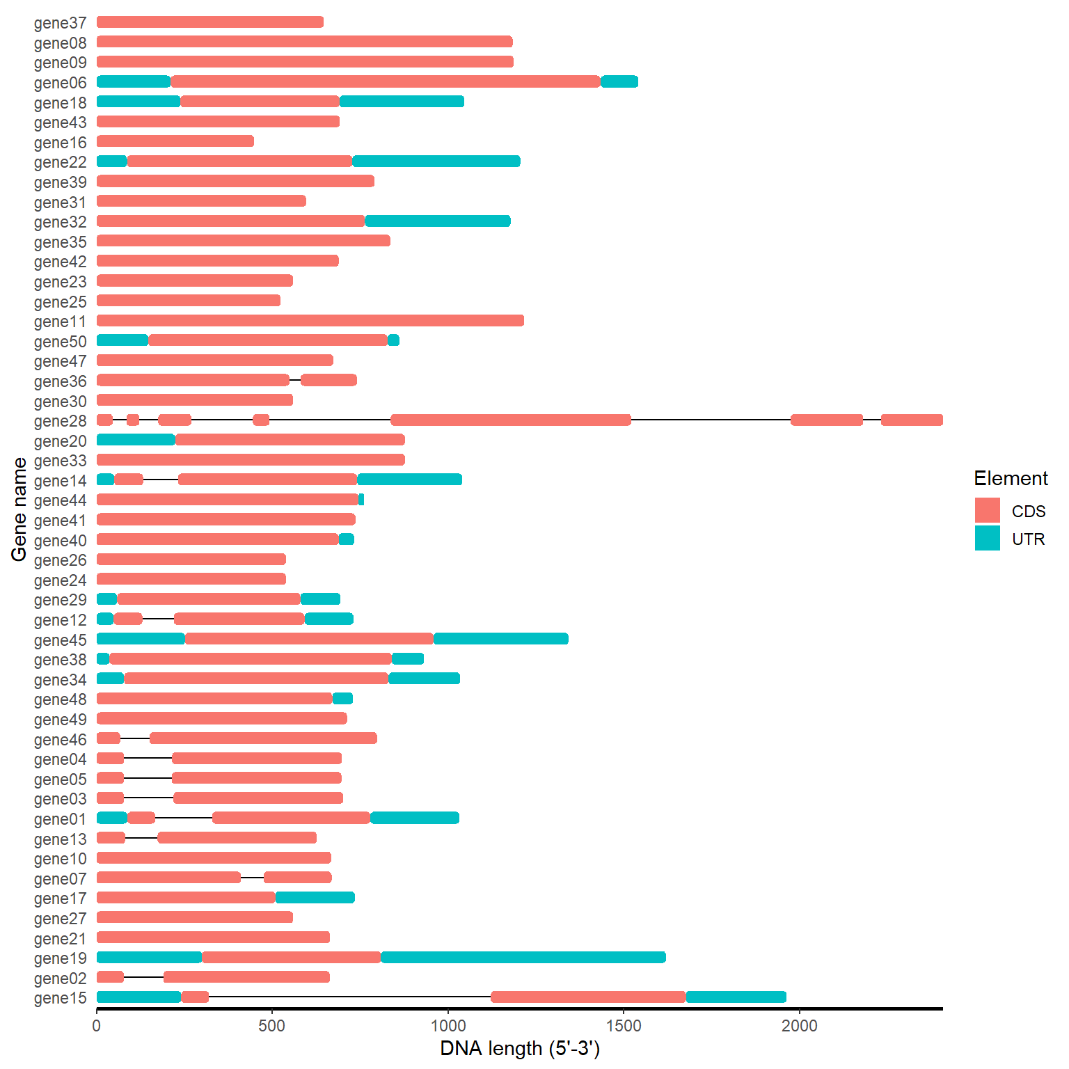 labs(x="DNA length (5'-3')", y="Gene name")
