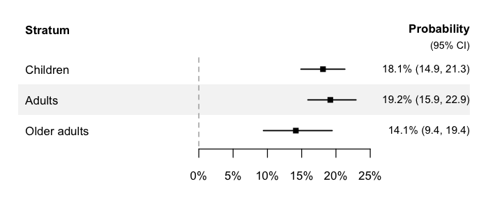 Forest plot of posterior infection probabilities. Supports combining multiple fits with section headers for multi-group comparisons.