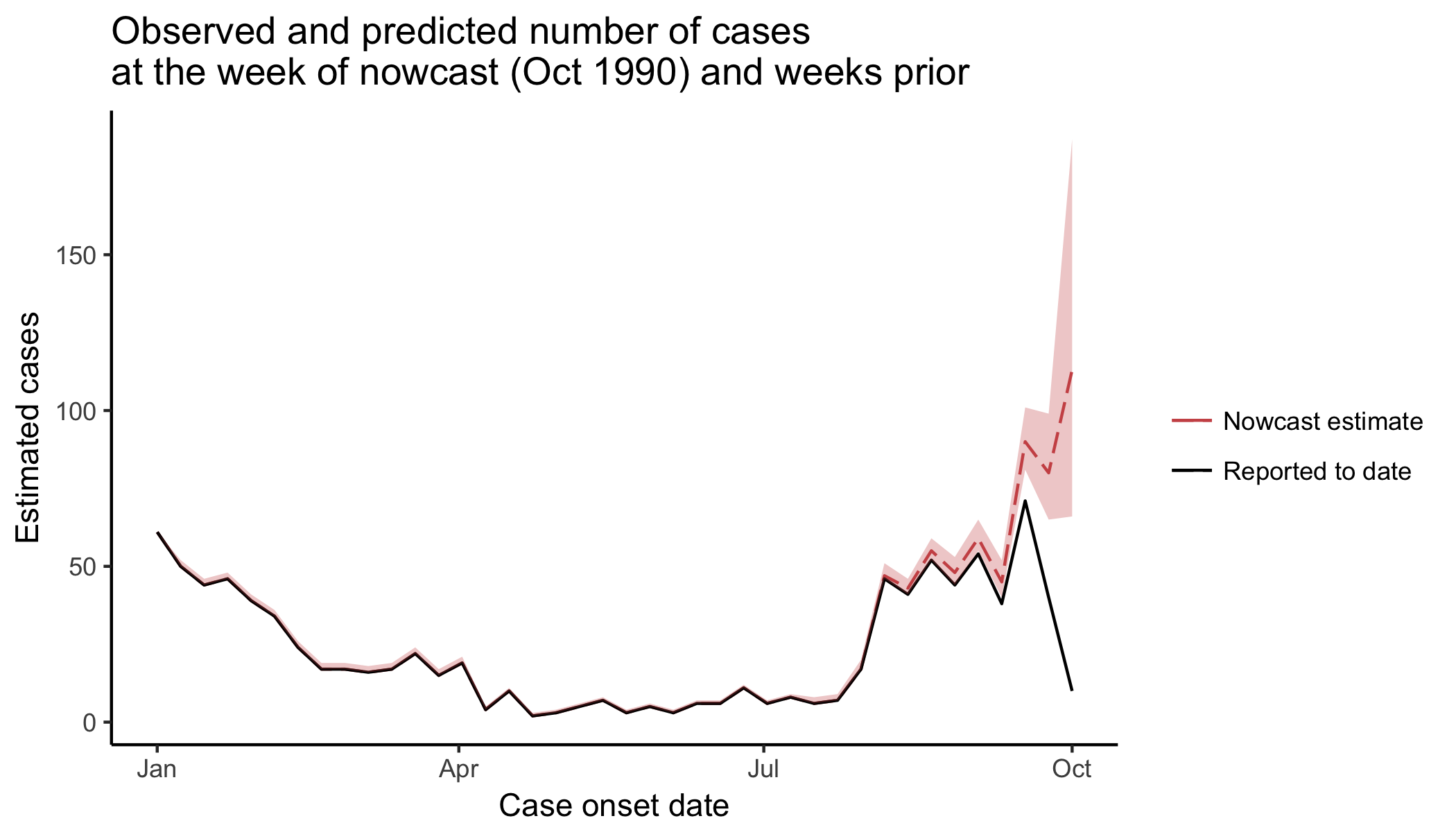 ggtitle("Observed and predicted number of cases \nat the week of nowcast (Oct 1990) and weeks prior")