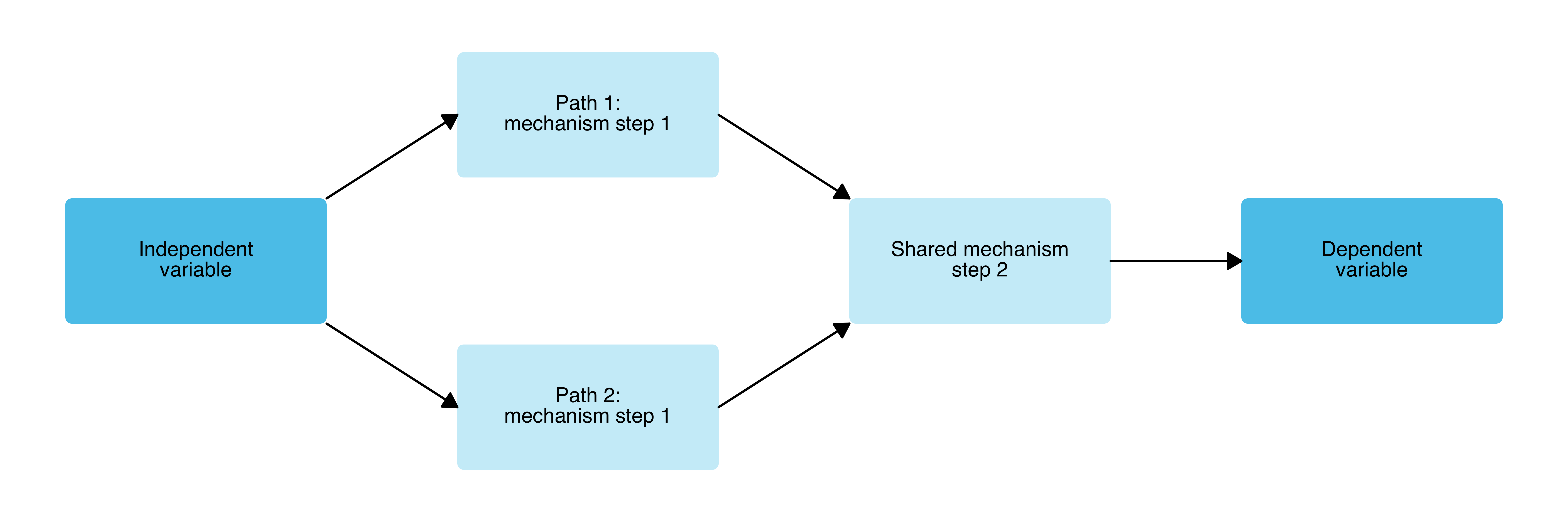 A causal diagram with two independent variables, each going through two sequential mechanism steps, before converging on a single outcome.
