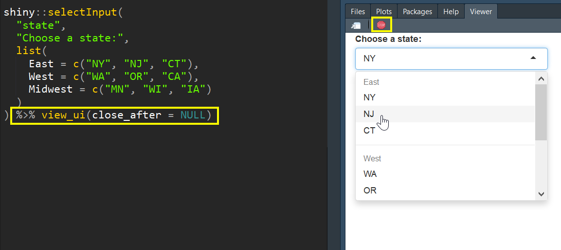 Note that close_after is set to NULL in this example. The view_ui() function launches an app and defaults to closing after 5 seconds. You can adjusts how long it runs or use NULL and stop it manually by using the stop sign.:red_circle: