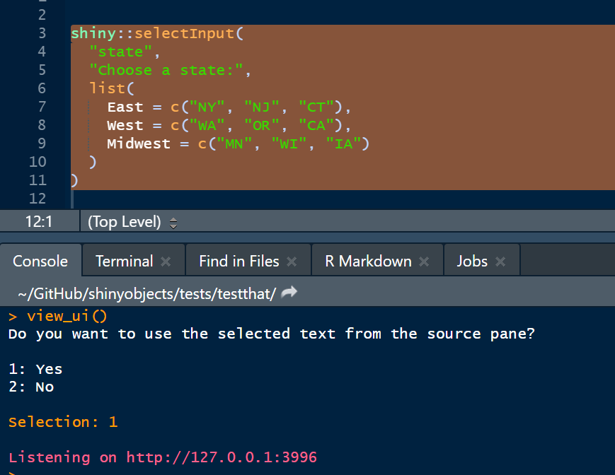 The package converts reactive data frames into functions that will read from your raw data and become available in your environment. The main function, load_reactive_objects(), will recommended that you create a dummy input list in your script to simulate reactive inputs. When you run load_reactive_objects(), it will prepopulate this list. You can learn more about dummy input lists in this vignette. The package also includes a function to view your UI elements in the viewer pane (see below).