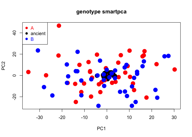 pcaR <- smart_pca(snp_data = pathToGenoFile, sample_group = my_groups, sample_project = my_ancient)