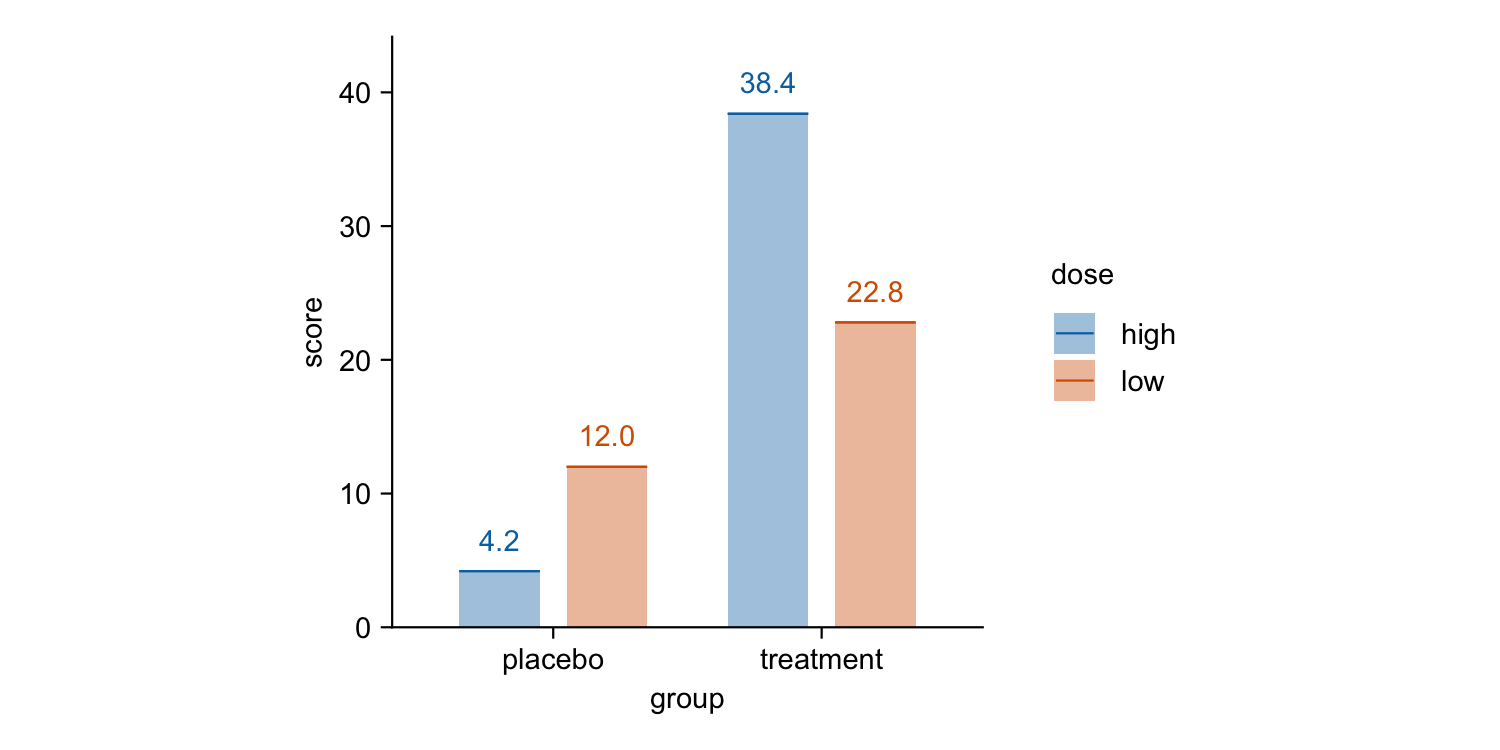 tidyplot(x = group, y = score, color = dose) |>