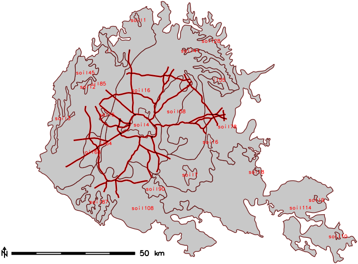 The colours in DXF drawing have been set up automatically. In this case, labels of roads and elevation labels of soil types have been switched of because of too large amount of the data. Examples of more detailed exports can be seen in (Stopkova, 2016).