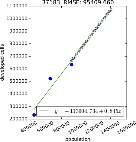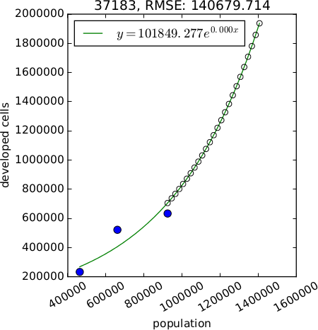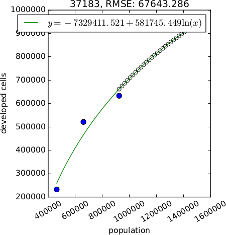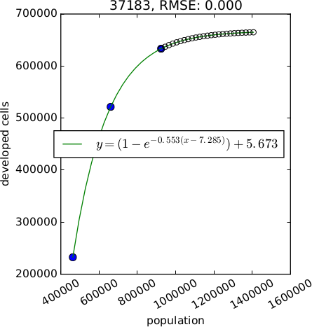 The method parameter allows to choose the type of relation between population and developed area. The available methods include linear, logarithmic (2 options), exponential and exponential approach relation. If more than one method is checked, the best relation is selected based on RMSE. Recommended methods are logarithmic, logarithmic2, linear and exp_approach. Methods exponential approach and logarithmic2 require scipy and at least 3 data points (raster maps of developed area).
