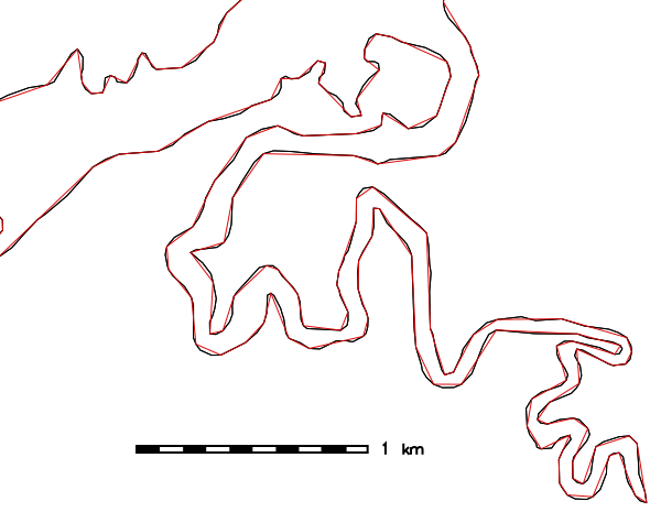 original map shown in black, smoothed map with 500% increased number of vertices shown in red)