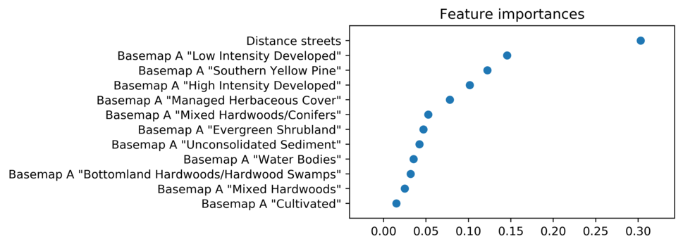 Feature importances in the model are plotted in a graph, which path and name has to be specified via the plot parameter. By default, class values are used. Optionally, class labels can be used as plot labels, using the flags -a and -b, for basemap_a and basemap_b respectively. If these flags are used, the raster should already contain the associated category labels. The module r.category can be used to set category labels for a raster map. If the flag(s) -a and/or -b is(are) selected without existing categories for the corresponding raster map, the class value will be kept.