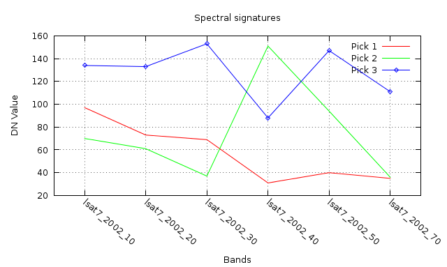 Spectral plot of 3 different land cover types: (1) water, (2) green
