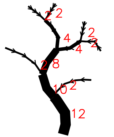 - if the node has two or more tributaries with greatest order i, then the Strahler order of the node is i + 1.