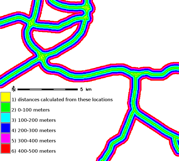 r.buffer Creates a raster map showing buffer zones surrounding cells that contain non-NULL category values.