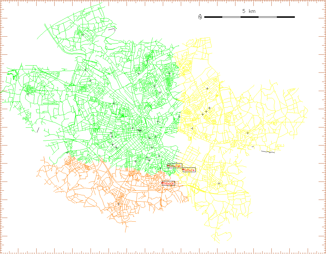 v.net.alloc input=schools_net output=schools_alloc ccats=200-210 #check for present categories (school IDs) v.category schools_alloc option=print | sort -nu 0 201 204 209 d.erase #show all streets and schools: d.vect schools_net #show reachabilities as calculated above: d.vect schools_alloc col=green cats=201 d.vect schools_alloc col=yellow cats=204 d.vect schools_alloc col=orange cats=209 #highlight the selected schools: d.vect schools disp=attr attr=poiName bcolor=black cat=200-210 d.vect schools_net ty=point cat=200-210 col=red icon="basic/circle" size=5 #nice frame etc: d.grid -g s=1000lloc col=orange cats=209 d.barscale -t bc=white tc=black at=60,5