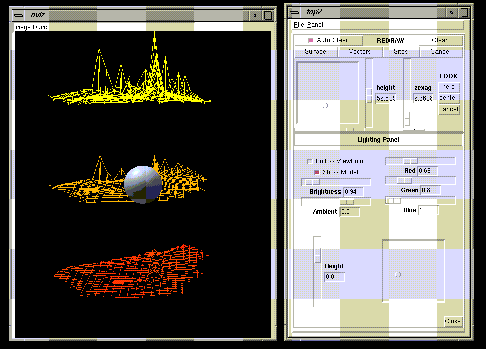 nviz is a GRASS module-in-progress which allows users to realistically render multiple surfaces in a 3D space, optionally using thematic coloring, draping GRASS vector maps over the surfaces, and displaying GRASS site files either draped on the surfaces or as 3D point locations.