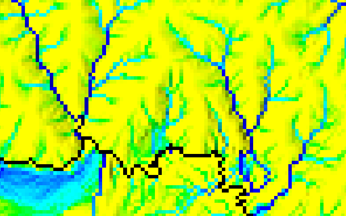 Weighed flow accumulation map (spatial subset with lake in the southern half)