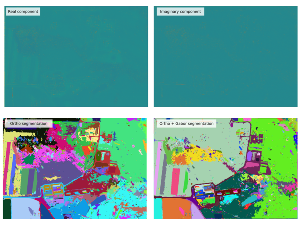 After the Gabor filter is generated, it can be used for a number of purposes. For instance, we can create a segmented raster map of ortho_2001_t792_1m aided with both the real and imaginary component of the Gabor filter which is able to reduce noise in the output raster map.