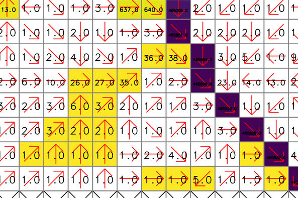 There are slight differences between the two output maps. The yellow and purple cells show the difference raster map (flow_accum_diff). The red arrows and numbers represent drainage directions (drain_directions) and flow accumulation by r.watershed (flow_accum), respectively. Note that some cells close to headwater cells are assigned 1 even though they are located downstream of other cells.