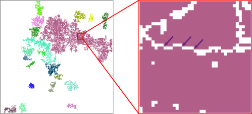 clumped. Clumps below an user-defined size (minimum area for fragments)