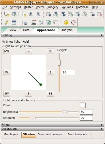 For each session of wxNviz, you might want the same set of 2D/3D raster and vector data, view parameters, or other attributes. For consistency between sessions, you can store this information in the GRASS workspace file (gxw). Workspace contains information to restore "state" of the system in 2D and if wxNviz is enabled also in the 3D display mode.