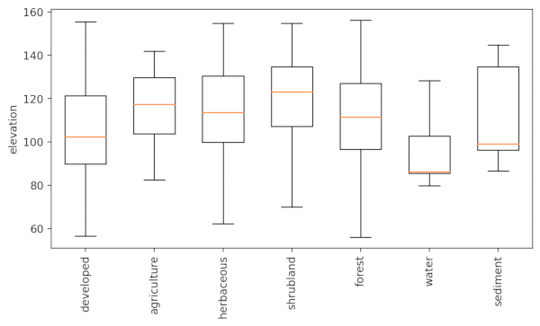 Draw boxplots of the values of the elevation layer per category from the landclass96 layer from the same NC sample dataset. Use the -r flag to rotate the x-asis labels.