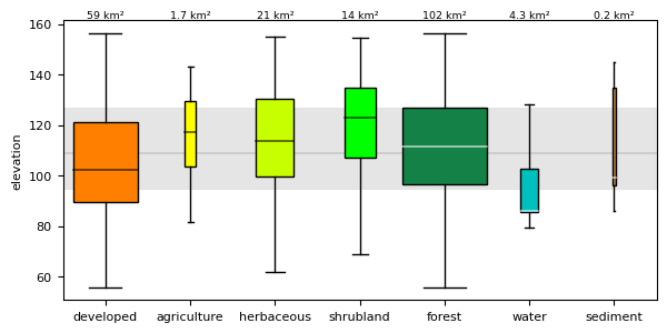 To make it easier to compare the elevation distribution across the different land classes, you can plot a line and band representing the median and interquartile range of the whole raster layer.