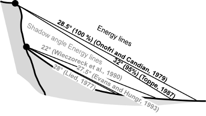 Energy line used for the cone method from the top or the bottom of a cliff (shadow angle), according to various authors (Image from Jaboyedoff and Labiouse, 2003)