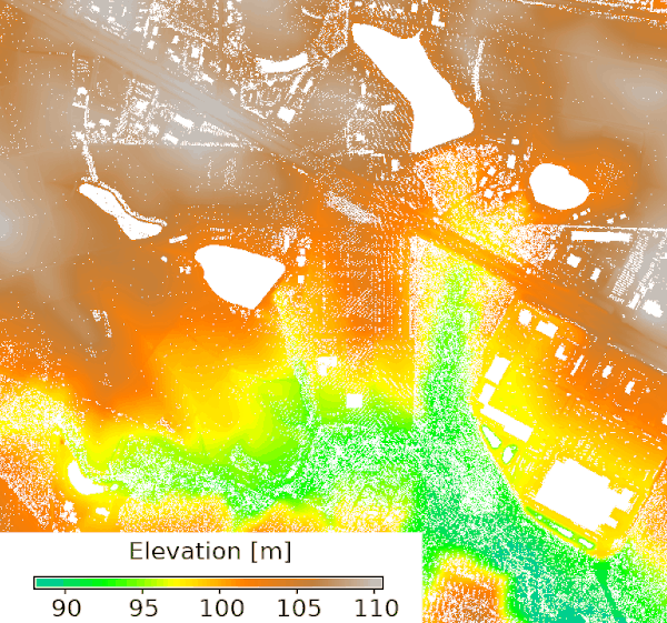 While this tool was designed for water bodies, it can be used for other purposes, e.g., for filling a gap in digital elevation models caused by excluding buildings.
