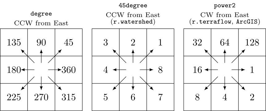 45degree: degrees CCW from East divided by 45 (e.g. r.watershed)
