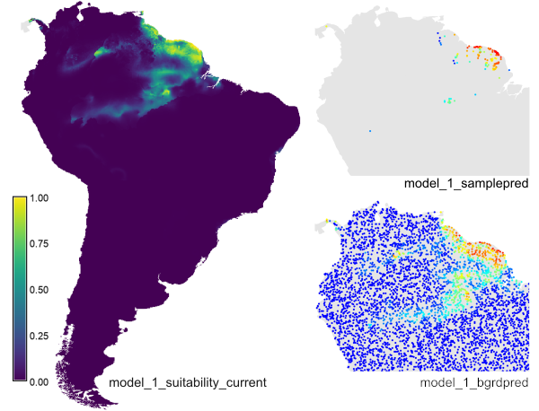 The projectionlayers parameter is optionally. If you set it, a raster prediction layer will be created that represent the potential suitability distribution under current conditions (the conditions used to train the model).