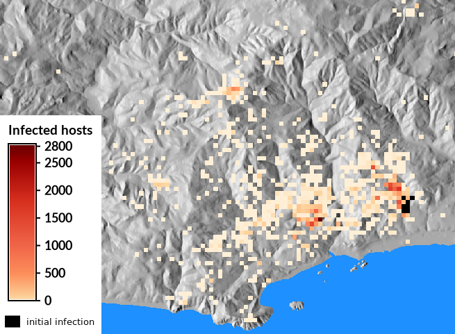Figure: Infected hosts in a landscape, a typical model result