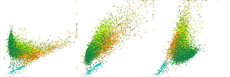 Figure: One scatter plot in with one variable as Z coordinate and another variable as color (two rotated views).