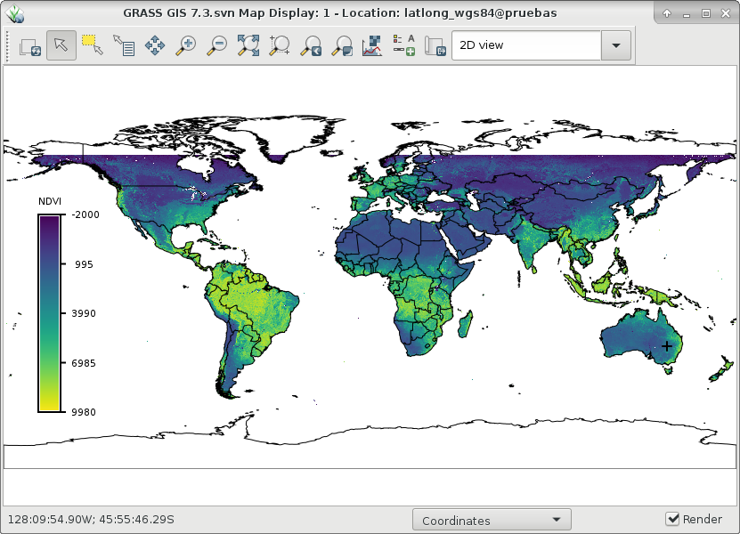 Determine occurrence/number of seasons with their respective start and end dates (in the form of map indexes) in global NDVI data. Let's use the example from i.modis.import to download and import NDVI global data and, create a time series with it: