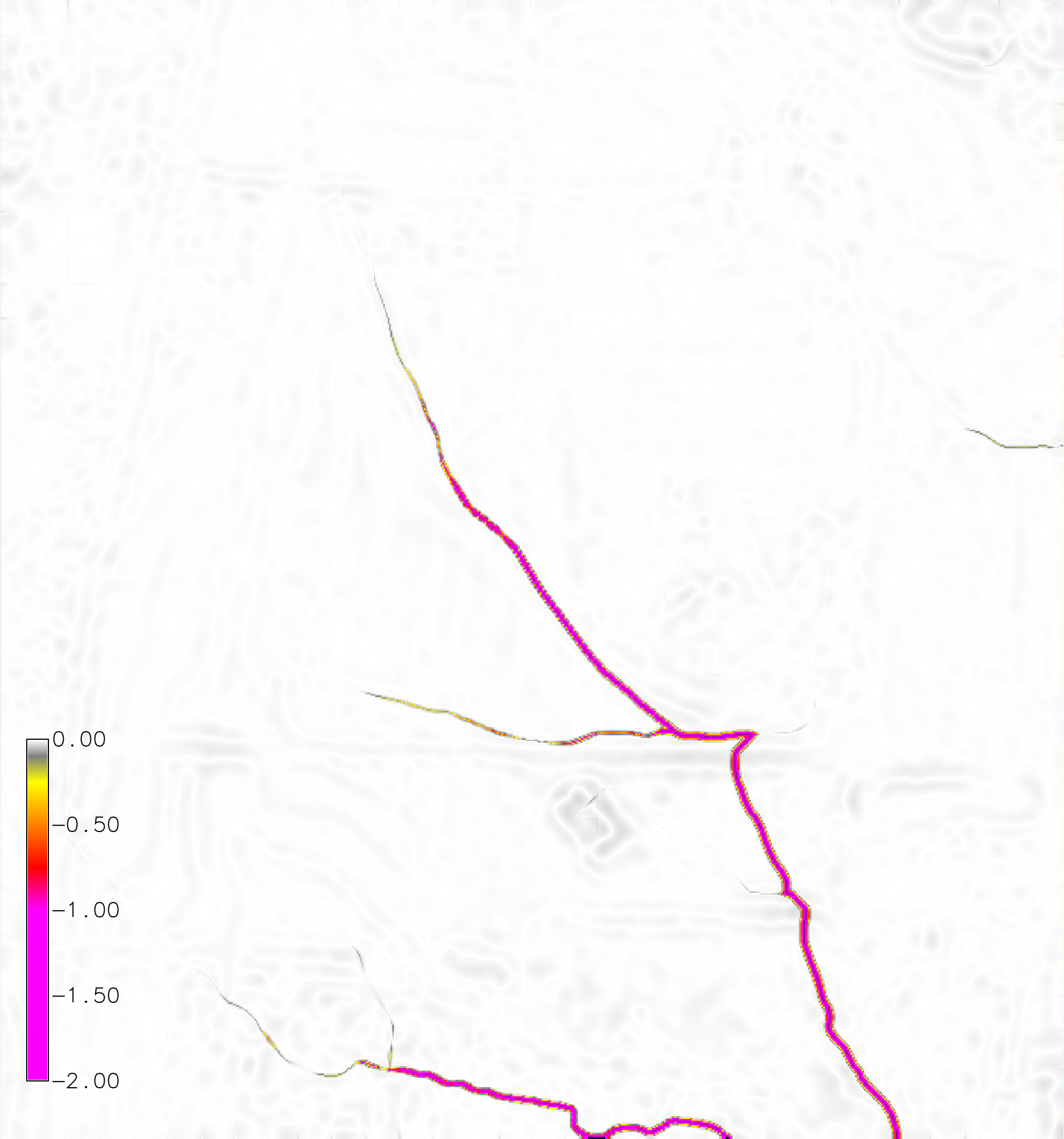 Figure: Net difference (m) for a steady state, transport limited SIMWE simulation of a 120 min event with a rainfall intensity of 50 mm/hr.