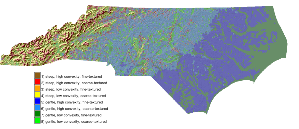 Optionally, these surface-form metrics along with slope-gradient can be used to produce a nested-means classification of the topography. Each class is estimated based on whether the pixels values for each variable exceed the mean of that variable. The classification sequence follows:
